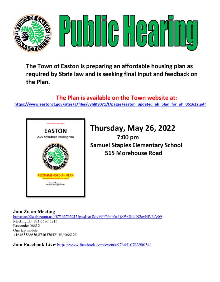 EASTON AFFORDABLE HOUSING HEARING, MAY 26, 7 PM